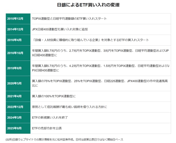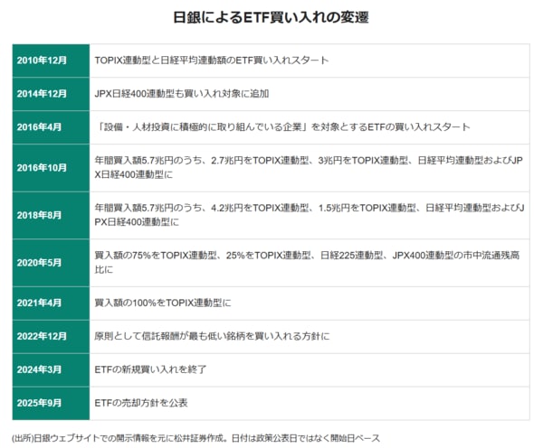 まずは日銀によるETF買い入れの歴史を振り返ってみよう。日銀が大規模な金融緩和策の一環として、異例のETFの買い入れを始めたのは2010年12月。当初は日経平均株価連動型とTOPIX(東証株価指数連動型)が対象だった。その後、買入額の増額などと合わせ、「JPX日経400指数」連動型や「設備・人材投資に積極的に取り組んでいる企業」を対象とするETF(以後、「設備・人材投資ETF」)などにも対象を広げていく。