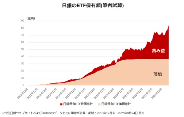 筆者の試算によれば、日銀の保有するETFは今年8月末時点で80兆円を超えており、足元は85兆円程度に達している可能性もある。あくまで試算ではあるが、日銀の保有するETFの時価は簿価の2倍以上になっている可能性が高い。
