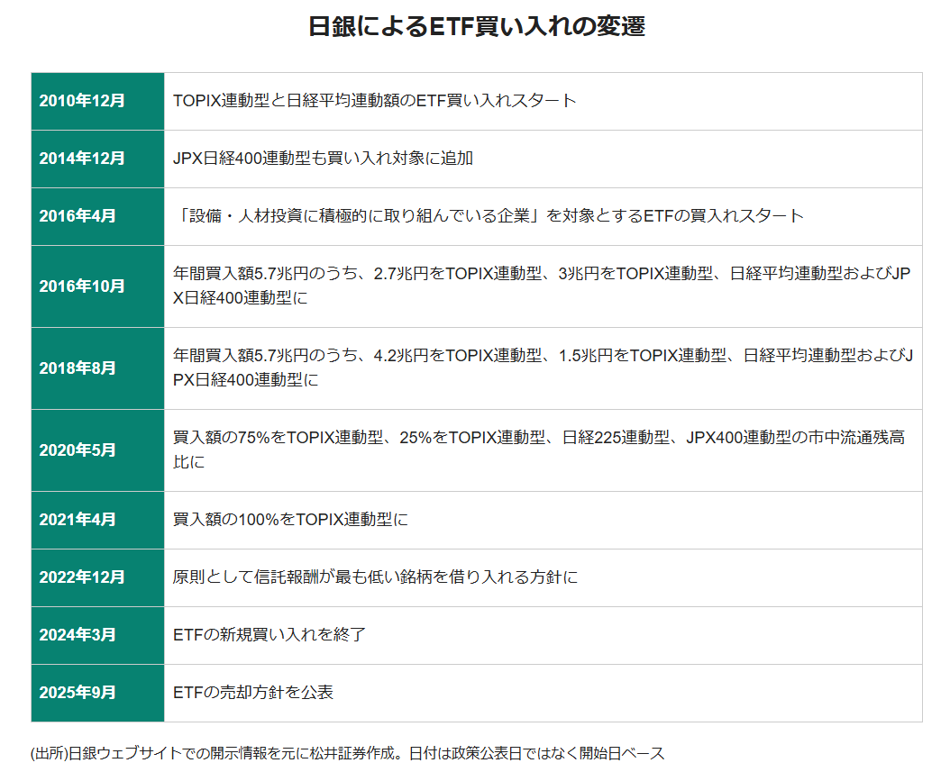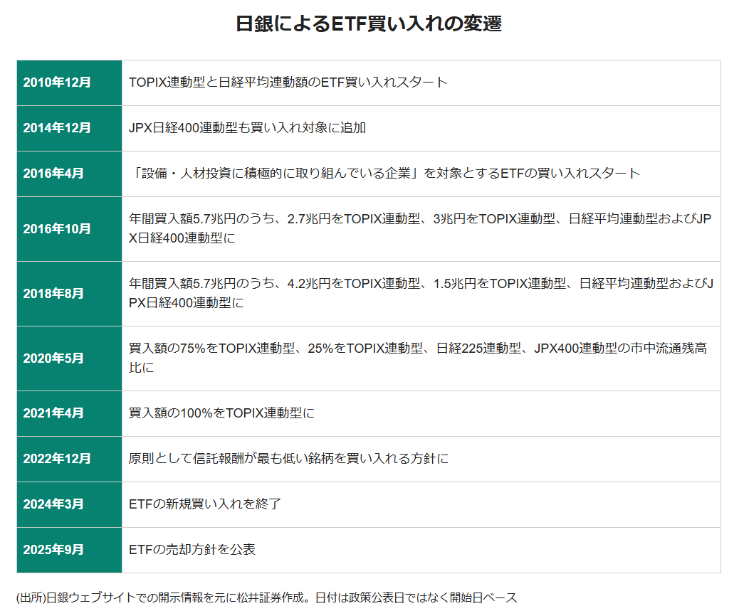 日銀によるETFの買い入れは、白川方明、黒田東彦、植田和男の3総裁時代をまたぐ計13年に及び、買い入れ額の合計は37兆円(簿価ベース)に達した。デフレ脱却への道筋が見えてきたことから、日銀は2024年3月に新規のETF買い入れの停止を発表。それから1年半後の2025年9月、日経平均株価が史上最高値を更新する中で、サプライズ発表となった。