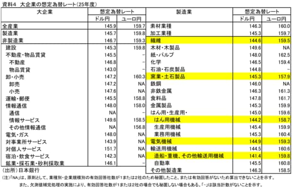 中でも、足元のレートよりも特に円高で今期の為替レートを想定しているのが「造船・重機、その他輸送用機械」「はん用機械」「繊維」「電気機械」「窯業・土石」となっている。