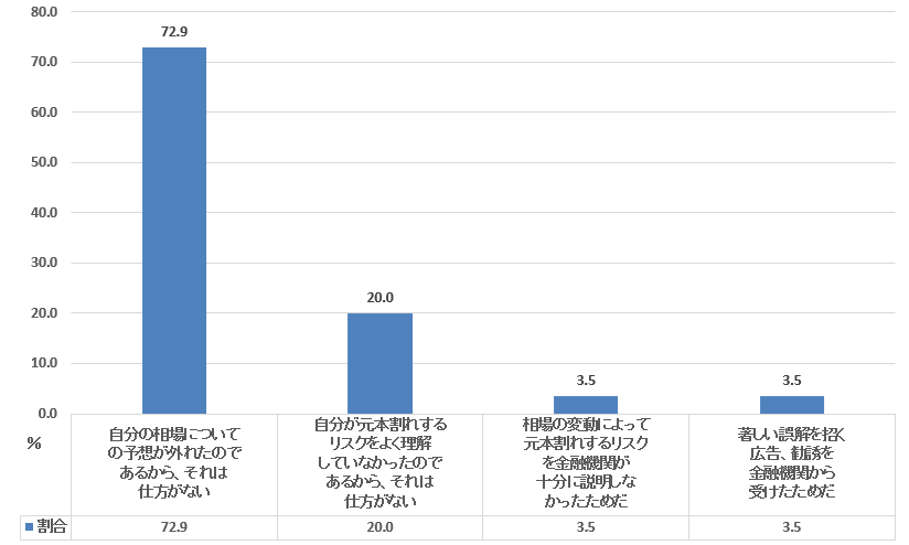 一方で「相場の変動によって元本割れするリスクを金融機関が十分に説明しなかったためだ」「著しい誤解を招く広告、勧誘を金融機関から受けたためだ」と金融機関側の問題とする回答はいずれも3.5%と少数派だった。全体としては、自分自身の問題として受け止める傾向が強いようだ。