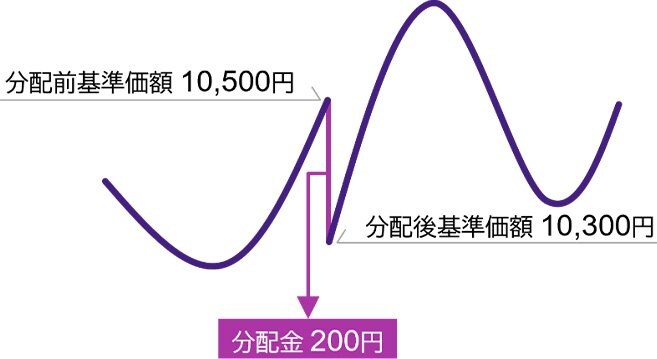 このグラフが示すように、分配は一部解約と同じことなので、必ずその分だけ基準価額が下がり、自身の資産の評価額は(分配金として)外に出した分だけ減っています。