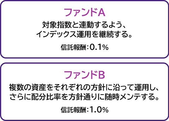 以下のファンドAとBを信託報酬の低さだけで比較すればAの圧勝ですが、Aの信託報酬とBの信託報酬にはそれぞれ理由があるはず。それぞれのエンジン、つまり「中身が何か?」がない限り、判断は下せないはずです。
