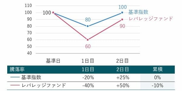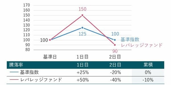 <基準指数と2倍レバレッジファンドの値動きの例①>