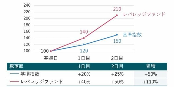 レバレッジファンドの場合は、基準となる指数や資産の「日々の値動き」の〇倍になるような運用されます。例えば、日経平均株価の2倍レバレッジファンドなら、ある日の日経平均株価が+2%動けば+4%、-1%なら-2%のような変化をすることを目指します。