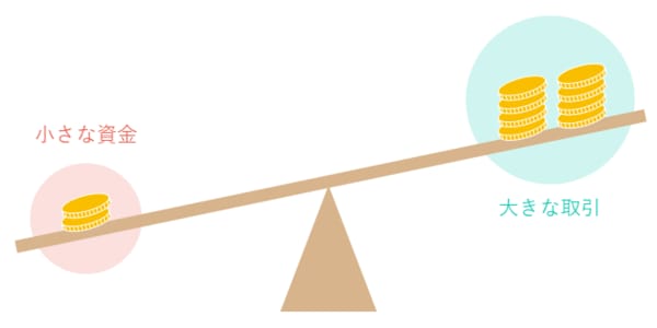 レバレッジ(leverage)とは、小学校の理科などで習う「てこの原理」からきているものです。てこの原理は、小さな力で大きな物を動かせるというもの。投資の世界では少額の資金で実質的には大きな金額を運用し、そのリターンを獲得するための仕組みとして紹介されます。