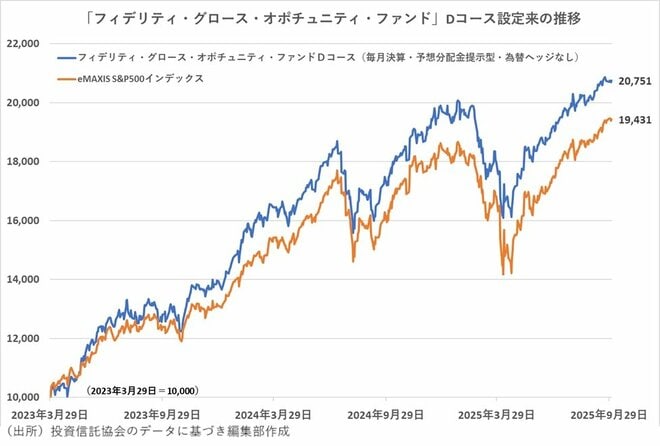 実際に、「フィデリティ・グロース・オポチュニティ・ファンド Dコース」について2023年3月の設定からの基準価額(分配金込み)の推移を「eMAXIS S&P500インデックス」と比較すると、「フィデリティ・グロース・オポチュニティ・ファンド Dコース」が一貫してS&P500を上回る成績を残していることがわかる。「フィデリティ・グロース・オポチュニティ・ファンド Dコース」は、米国株のみならず世界の成長株を投資対象としているため「S&P500」がベンチマークではないのだが、同ファンドの組み入れ銘柄の約9割が米国株で占められていることから、米国を代表するインデックスと比較した。