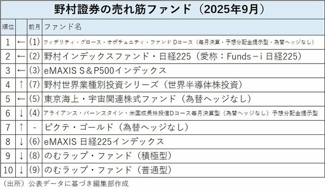 野村證券の投信売れ筋ランキング2025年9月のトップ3は前月と同じだった。トップに「フィデリティ・グロース・オポチュニティ・ファンド Dコース(毎月決算・予想分配金提示型・為替ヘッジなし)」、第2位が「野村インデックスファンド・日経225(愛称:Funds-i日経225)」、第3位は「eMAXIS S&P500インデックス」だった。第4位には前月の第7位から「野村世界業種別投資シリーズ(世界半導体株投資)」がジャンプアップした。また、トップ10圏外から「ピクテ・ゴールド(為替ヘッジなし)」が第7位にランクインした。
