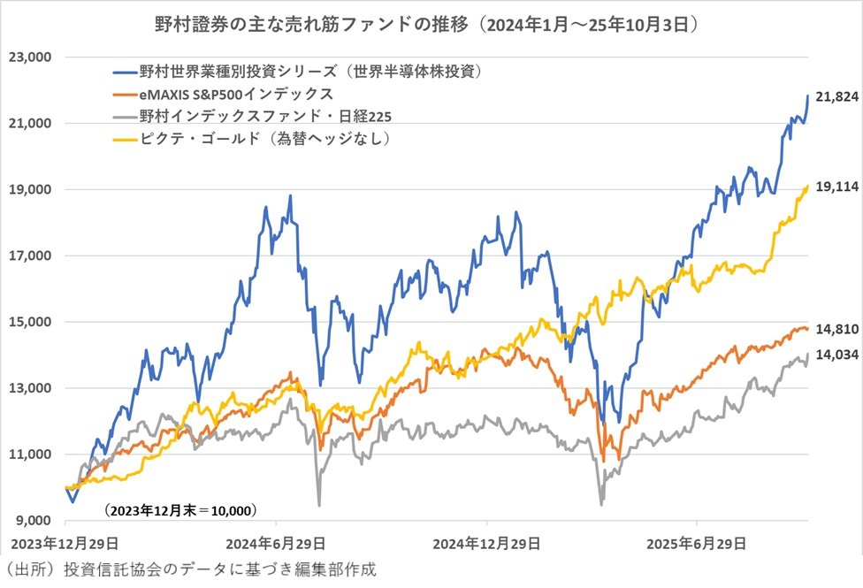 野村證券の売れ筋ランキングの評価を高めたのは「野村世界業種別投資シリーズ(世界半導体株投資)」と「ピクテ・ゴールド(為替ヘッジなし)」だった。