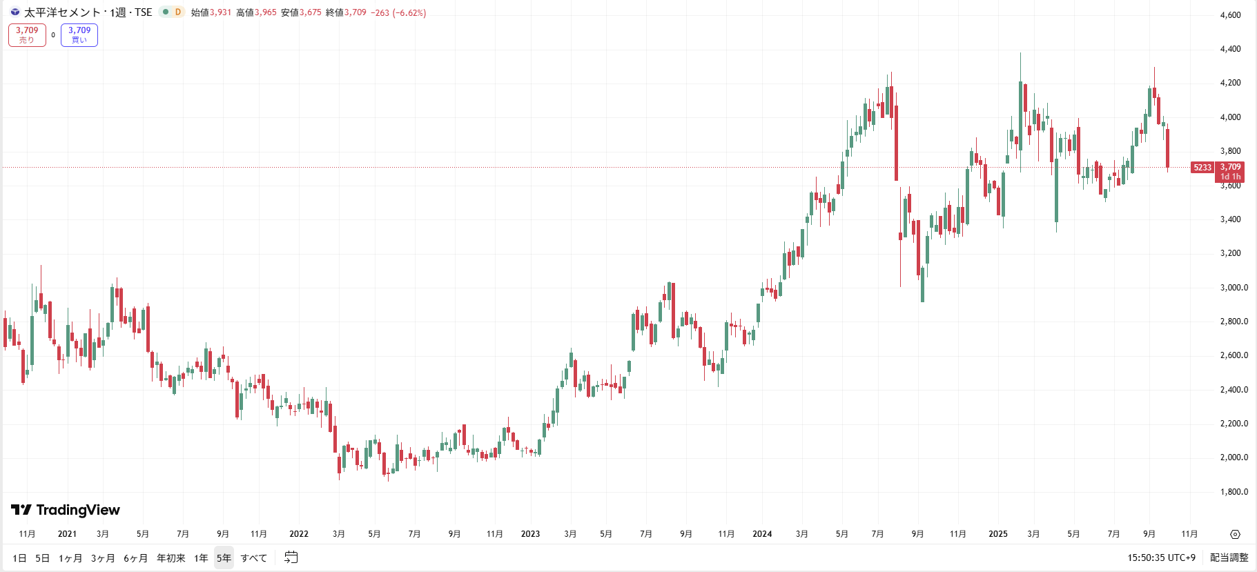 しかし、23年に入ると上昇トレンドとなりました。24年5月には、19年4月以来に約5年ぶりに4000円台を一時回復します。苦戦の国内セメント事業が4期ぶりに黒字化し、業績の拡大を期待した買いが入ったと考えられます。その後、日本株式市場の急落やトランプ関税ショックなどで値を下げますが反発し、現在は3709円で取引されています(25年10月2日終値)。