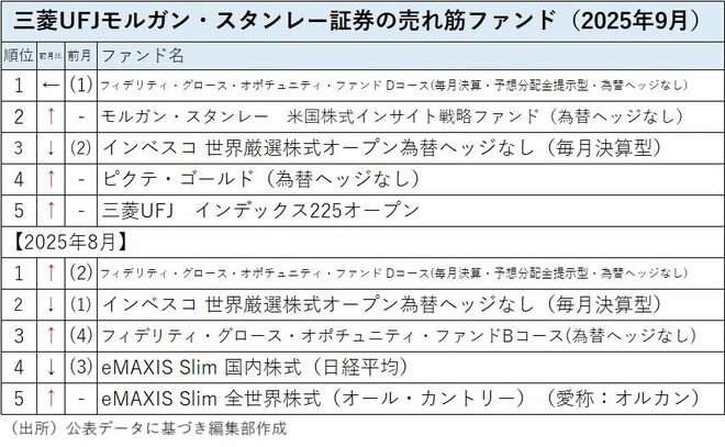 三菱UFJモルガン・スタンレー証券の投信売れ筋ランキングの2025年9月のトップは前月に引き続き「フィデリティ・グロース・オポチュニティ・ファンド Dコース(毎月決算・予想分配金提示型・為替ヘッジなし)」だった。前月は第2位だった「インベスコ 世界厳選株式オープン為替ヘッジなし(毎月決算型)」(愛称:世界のベスト)は第3位に後退し、第2位には「モルガン・スタンレー 米国株式インサイト戦略ファンド(為替ヘッジなし)」がランクインした。また、トップ5圏外から「ピクテ・ゴールド(為替ヘッジなし)」が第4位に、「三菱UFJインデックス225オープン」が第5位にランクインした。