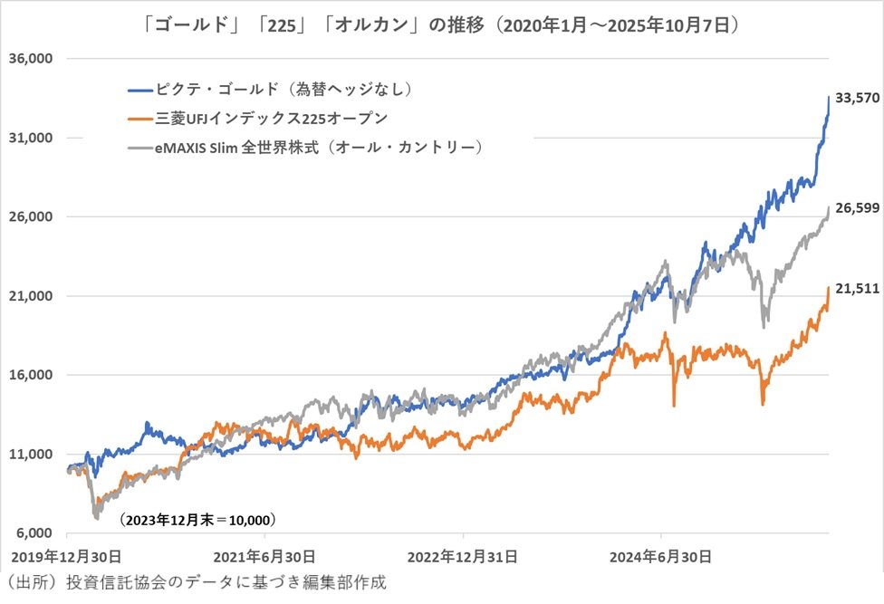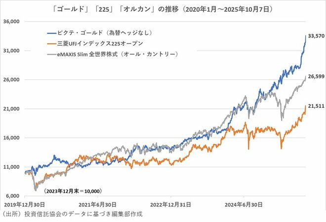 起点(10,000)を2019年12月末に置くと、2024年12月末までは「ゴールド・ファンド(為替ヘッジなし)」と「オルカン」は、ほぼ同じような成績だった。2024年12月末時点で「ゴールド・ファンド(為替ヘッジなし)」は23,645、「オルカン」は23,591だった。ところが、10月7日時点では「ゴールド・ファンド(為替ヘッジなし)」は33,570になり、「オルカン」の26,599を大きく引き離している。「オルカン」など株式ファンドは4月の株価急落で大きく下落したことに対して、「ゴールド」は一貫して上昇し続けたことが結果的に大きな差になったといえる。