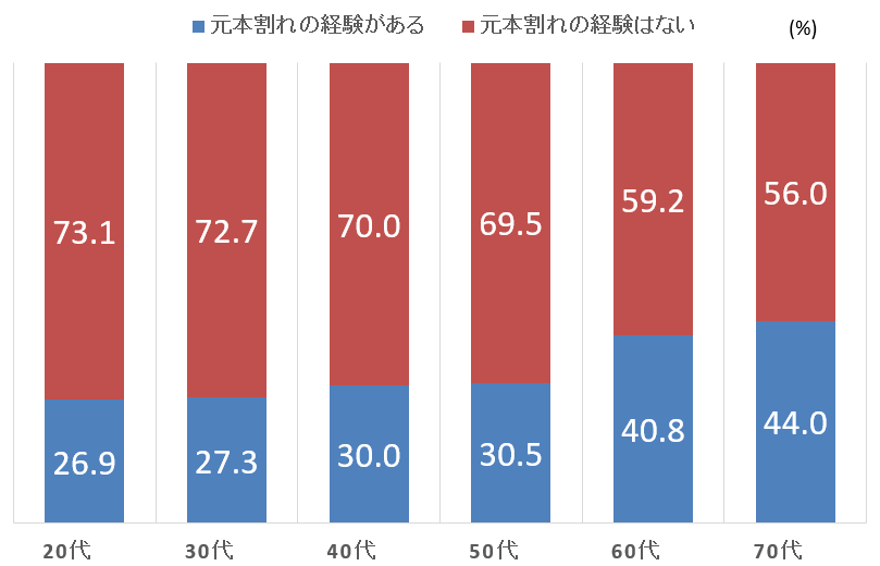 二人以上世帯のうち元本割れ経験がある割合は、年代が上がるにつれて一貫して増加する傾向が見られる。20代の26.9%から、30代、40代、50代と緩やかに上昇している。60代になると一気に40.8%と4割を超え、70代では44.0%と最も高い水準に達する。これは高齢層ほど投資経験が長い傾向にあり、バブル崩壊やリーマンショックなど過去の金融危機を経験している人が多いためと推測される。