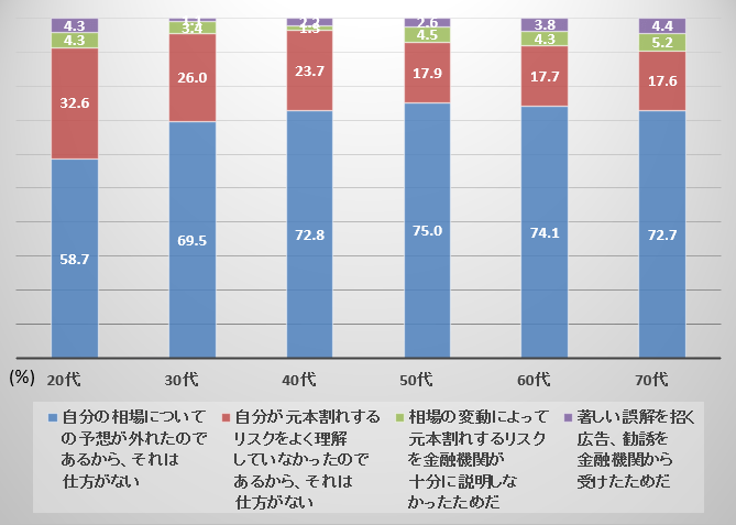 元本割れの経験率は年代が上がるほど高くなり、20代と70代では単身世帯で約30ポイント、二人以上世帯で約30ポイントの差がある。一因として、投資経験の長さが挙げられるだろう。元本割れをどう受け止めるかについては年代を問わず、相場の予想外れやリスク理解不足など自己責任と捉える人が約9割を占めた。特に若い層はリスクを理解していなかったとの回答が多く、20代二人以上世帯で最も高い結果となった。