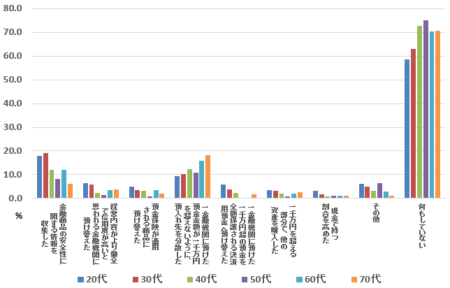 単身世帯では、「何もしていない」との回答が20代(58.7%)、30代(62.9%)、40代(72.8%)、50代(75.1%)、60代(70.4%)、70代(70.7%)となっている。若い層ほど何らかの行動をとっている傾向にあるようだ。特に20代、30代では安全性に関する情報収集を行ったとの答えが比較的多い。商品や金融機関を変更する割合も高い。なお、預金保全の観点から1つの金融機関に資産が集中しないよう分散したとの回答は60代、70代で高まっている。