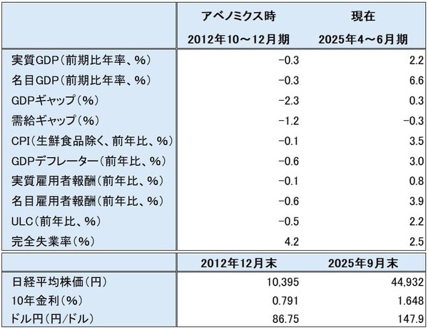 図表3は代表的な経済・物価指標を、第2次安倍内閣が誕生した2012年10-12月期と現在(2025年4-6月期)で比較したものですが、これを見ると掲載した全ての指標において、アベノミクス当時と大きく異なることが確認できます。