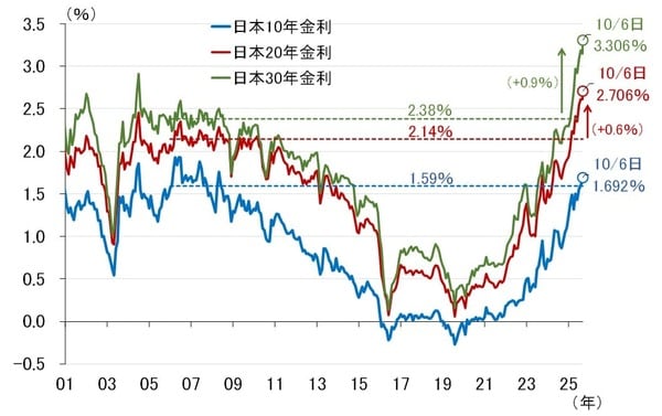 債券市場では財政拡張への警戒感が強まった結果、10年金利が前週末比0.03%上昇の1.692%、より財政リスクを反映しやすい超長期では、20年金利が0.09%上昇の2.706%、30年金利が0.14%上昇の3.306%まで水準を切り上げ、このうち30年金利は過去最高値を更新しました。