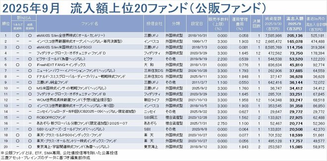 流入額上位20ファンドでは、トップ6は前月同様だった。トップの「eMAXIS Slim 全世界株式(オールカントリー)」(流入額2051億円、前月1685億円)以下、「インベスコ 世界厳選株式オープン(ヘッジなし、毎月決算型)」(同1651億円、1595億円)、「eMAXIS Slim 米国株式(S&P500)」(同1148億円、1134億円)、「フィデリティ・グロース・オポチュニティ・ファンド D」(同738億円、576億円)、「ピクテ・ゴールド(為替ヘッジなし)」(同535億円、304億円)、「iFreeNEXT FANG+インデックス」(同458億円、299億円)だった。流入額順位は変わらなかったが、「オルカン」、「フィデリティ・グロース・オポチュニティ・ファンド D」、「ピクテ・ゴールド(為替ヘッジなし)」、「iFreeNEXT FANG+インデックス」への資金流入額は勢いよく増額したが、「インベスコ 世界厳選株式オープン(ヘッジなし、毎月決算型)」と「eMAXIS Slim 米国株式(S&P500)」への流入増は小幅など、傾向が分かれた。