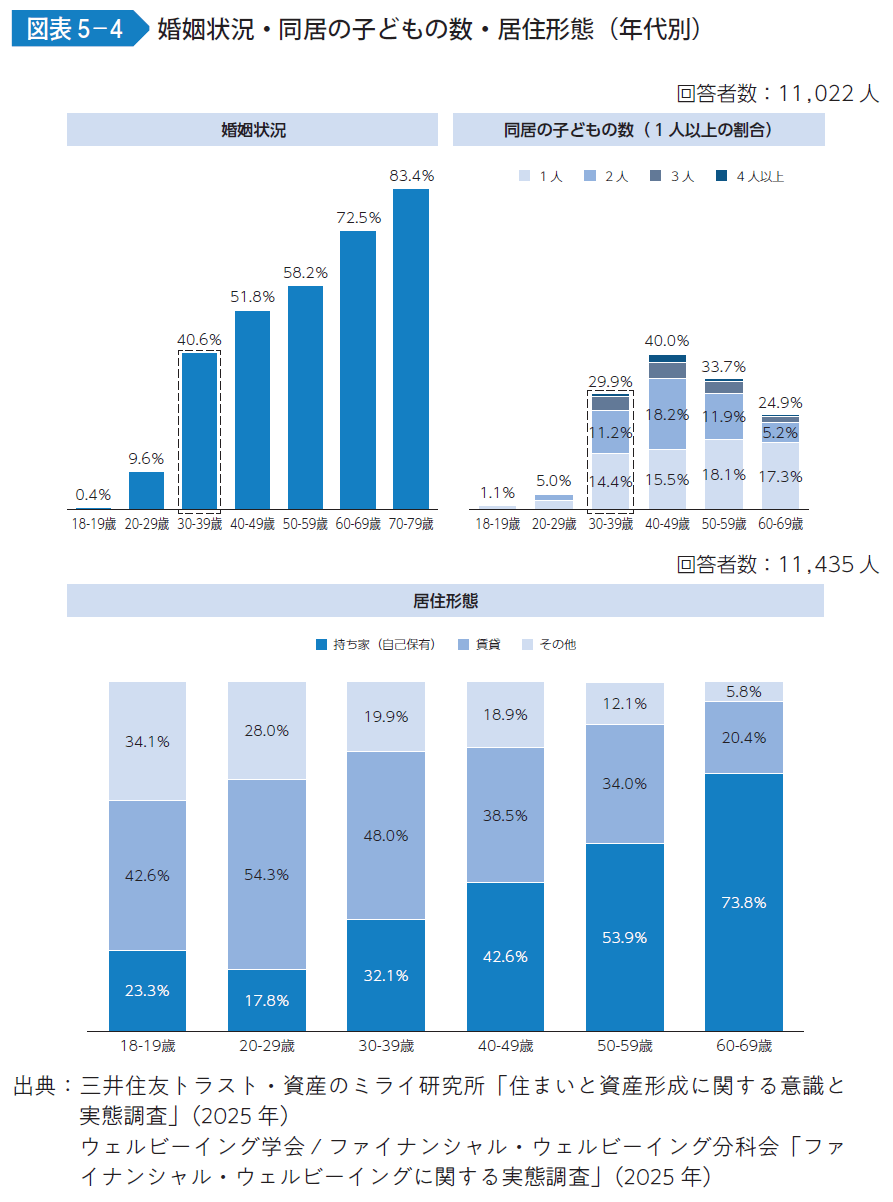 一方で、人生が多様化するなか、周囲の同年代の知り合いと「ライフイベントの歩み方」が異なることも多くなるのではないでしょうか。実際、[図表5−4]のとおり、30代・40代は、4〜5割が既婚、3〜4割が同居の子ども有、住まいは3〜4割が持ち家です。このように、人生の三大資金に関わるイベントの発生状況も大きく異なります。