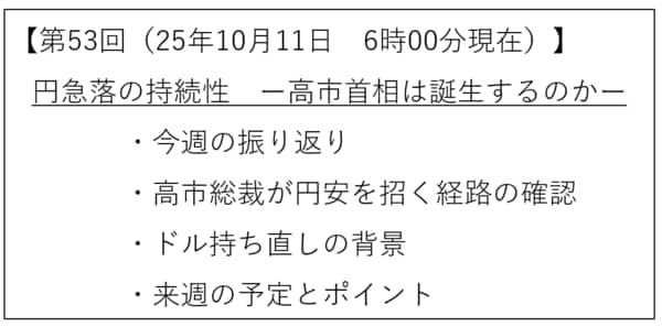 今回のマーケットトークのテーマは「円急落の持続性」です。高市自民党総裁の誕生によって円が急落した背景や今後の見通しを解説します。
