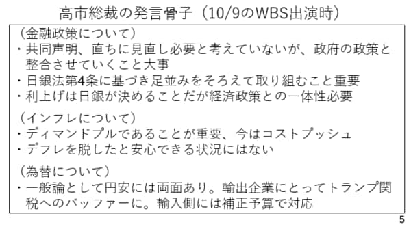 また、インフレについて現在はコストプッシュであると断じ、デフレを脱したと安心できる状況にはないとしました。円安については一般論と前置きしつつ、トランプ関税のバッファーにもなり得るものであるとして、メリットに言及しました。どちらかといえば円安をあまり問題視しない印象です。(スライド5)