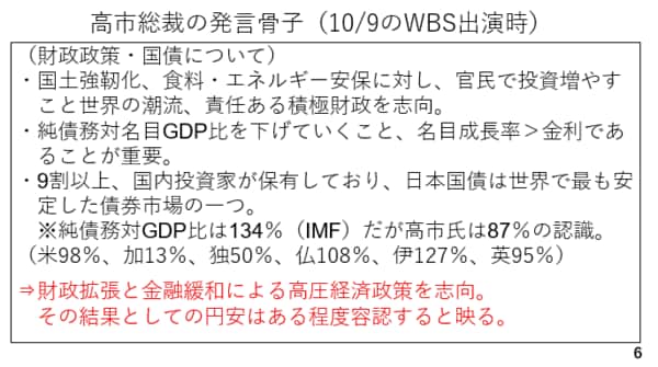 また、日本の国債市場に関し、国内投資家が9割以上を保有しているとの理由から世界で最も安定した市場であると説明しています。全体として見ますと財政拡張と金融緩和による高圧経済を志向する政策が講じられる可能性が高く、その結果としての円安もある程度容認する可能性が高いでしょう。(スライド6)