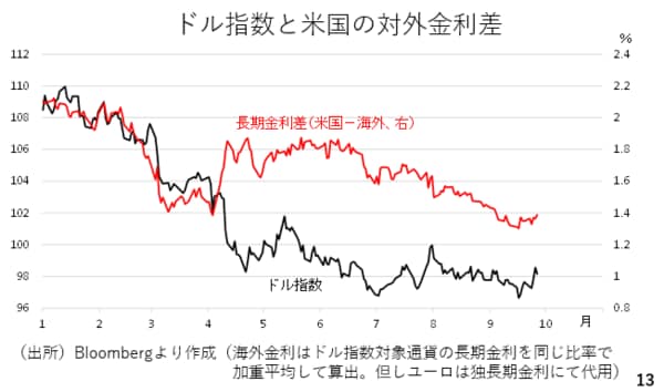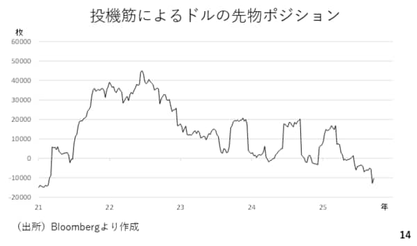 実際、投機筋のポジションも春先以降にドルショートとなっていますが、7月以降のドルの下げ渋りを踏まえ、ドルを買い戻す動きが出始めていても不思議ではありません。(スライド13)