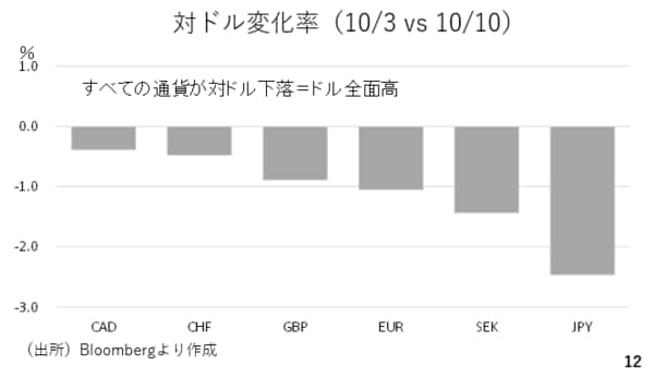 今週は円安が目立った週でしたが、実際にはドルもじわりと上昇しています。主要通貨の対ドル変化率を見ますと今週は多くの通貨が対ドルで下落しています。(スライド12)