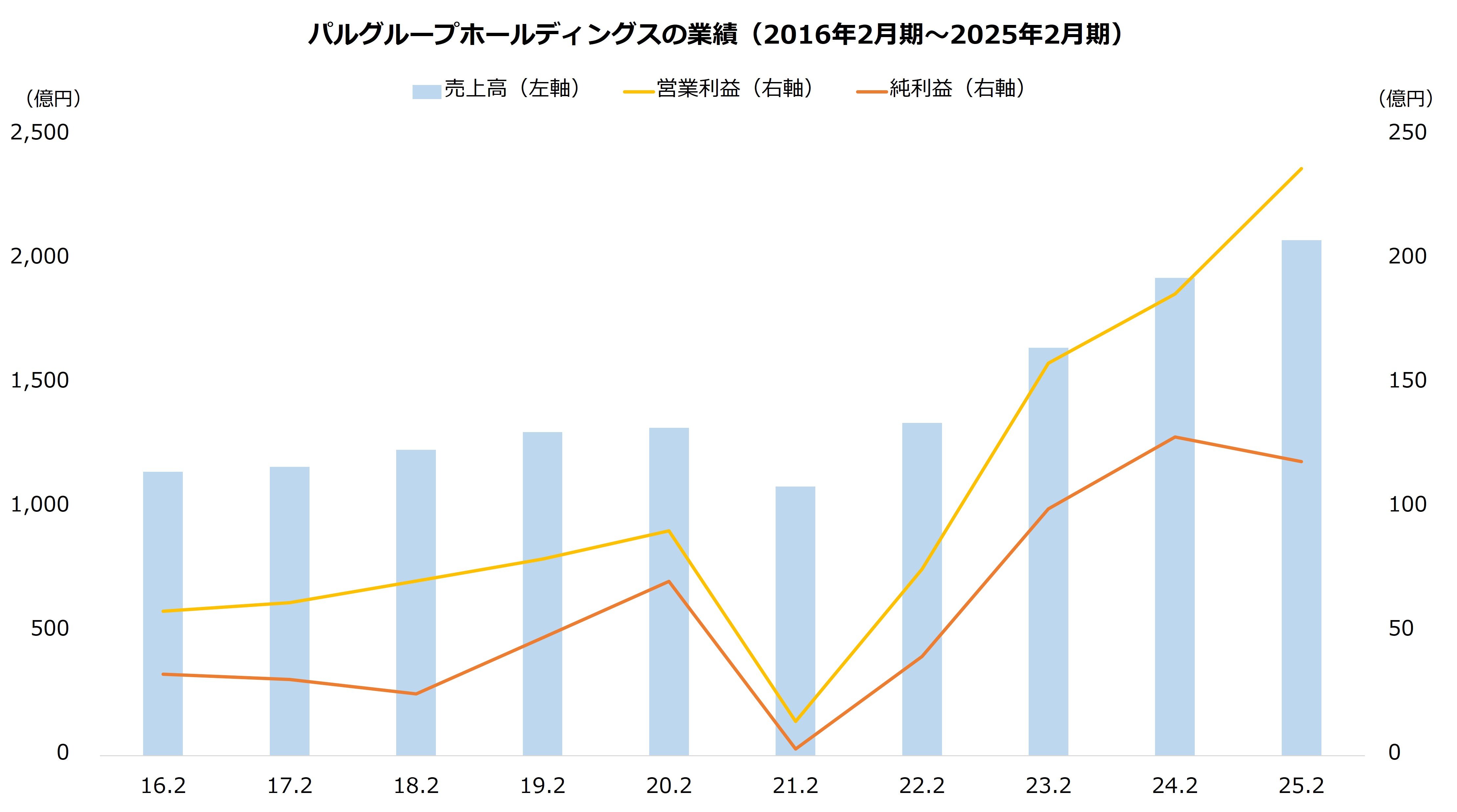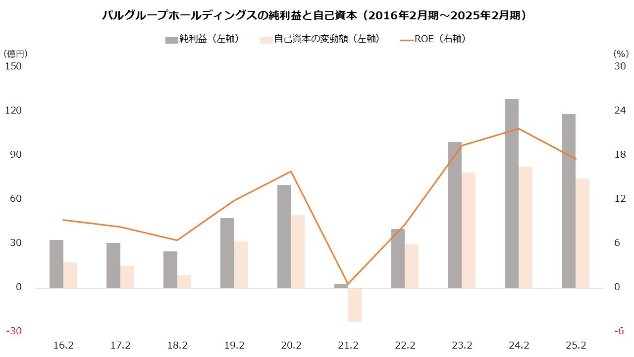 高水準のROEは利益の成長が主因ですが、それだけではありません。資本の引き締め策も貢献しています。たとえば、パルグループホールディングスの純利益は25年3月期までの10年で累計596億円に達しますが、自己資本の増加額は366億円にとどまります。