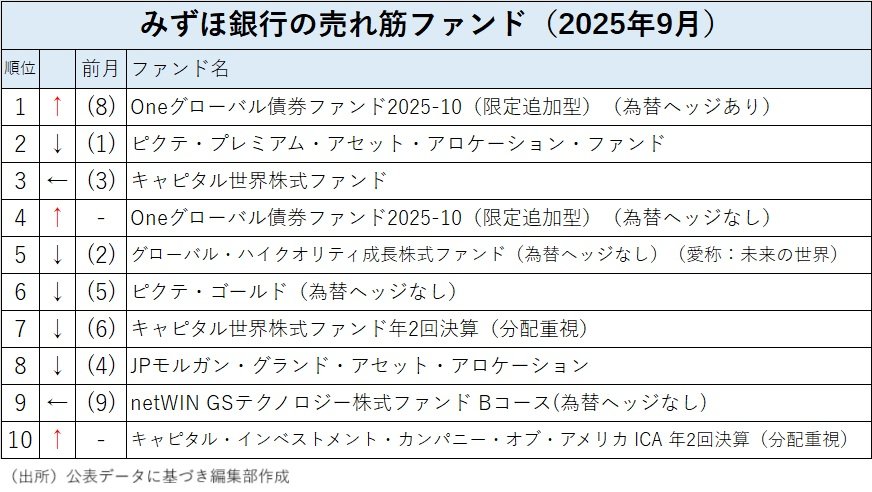 みずほ銀行の投信売れ筋ランキングの2025年9月のトップは「Oneグローバル債券ファンド2025-10(限定追加型)(為替ヘッジあり)」だった。「Oneグローバル債券ファンド2025-10(限定追加型)(為替ヘッジなし)」も第4位に食い込んでおり、限定追加型の債券ファンドが人気を集めた。2024年11月から10カ月連続でトップだった「ピクテ・プレミアム・アセット・アロケーション・ファンド」は第2位に後退した。そして、前月第3位だった「キャピタル世界株式ファンド」は第3位にとどまり、第2位だった「グローバル・ハイクオリティ成長株式ファンド(為替ヘッジなし)(愛称:未来の世界)」が第5位に後退した。また、前月は第4位だった「JPモルガン・グランド・アセット・アロケーション」は第8位にまで下がった。そして、トップ10圏外に落ちていた「キャピタル・インベストメント・カンパニー・オブ・アメリカ ICA年2回決算(分配重視)」が第10位に入った。