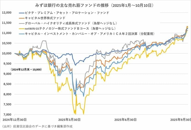 みずほ銀行の売れ筋トップ10の主なファンドのパフォーマンスを調べると、2025年10月10日時点で年初来の騰落率が12%前後の水準に収れんしている。売れ筋トップを続けてきた「ピクテ・プレミアム・アセット・アロケーション・ファンド」の12.32%を軸にして、それを上回る「キャピタル世界株式ファンド」が13.12%、下回る「グローバル・ハイクオリティ成長株式ファンド(為替ヘッジなし)」が11.17%になっている。その他は「netWIN GSテクノロジー株式ファンド Bコース(為替ヘッジなし)」が12.74%、「キャピタル・インベストメント・カンパニー・オブ・アメリカ ICA」が12.08%だ。