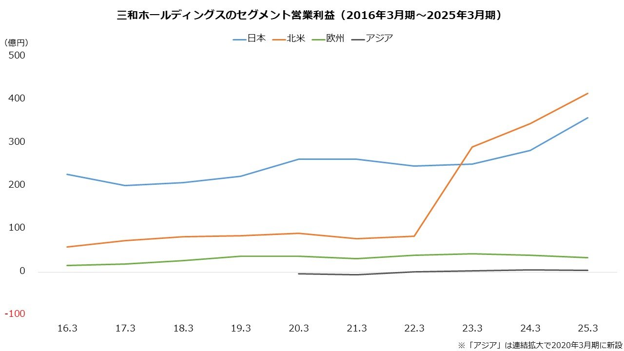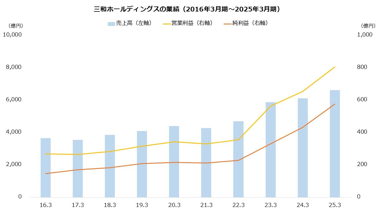 三和ホールディングスの業績は拡大傾向です。主要市場の日本や北米および欧州で価格転嫁が進み、利益が大きく増加しました。売上高および営業利益は、25年3月期で4期連続の過去最高を達成しています。
