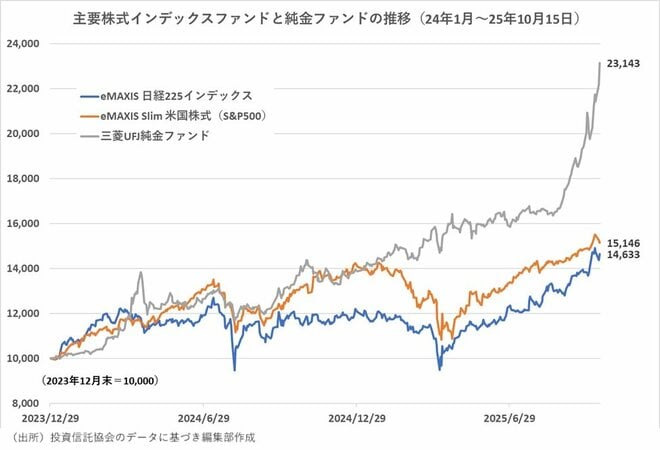 9月のランキングで売れ筋トップ10にランクインした「三菱UFJ純金ファンド」は、パフォーマンスで他の株式ファンドを圧倒するものがある。2023年12月末を基準とし、新NISAが始まった2024年1月以降の基準価額の推移をみると、2025年10月15日時点で騰落率が2.3倍になっている。日米株式の主要インデックスファンドである「eMAXIS Slim 米国株式(S&P500)」が約1.51倍、「eMAXIS 日経225インデックス」が約1.46倍であることと比較しても圧倒的だ。株式ファンドは2024年8月、そして、2025年4月に大きな下落局面があるが、純金ファンドにはそのような下落局面もなく上昇を続けたことで株式ファンドとの間に収益格差が生まれている。