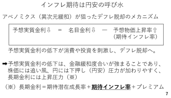 以下の枠内の式は異次元緩和の際、黒田総裁(当時)が経済に対する波及経路として説明したものです。即ち、期待インフレ率(日銀はこれを予想物価上昇率と呼びます)が高まれば、先々の実質金利の低下が予見されます。これは予想実質金利の低下を意味し、消費や投資を後押しするとされました。この予想実質金利の低下は、金融緩和度合いが強まることであり、株式相場にとっては追い風となります。一方、先々の実質金利の低下を見越して円相場には下落(=円安)圧力が加わります。また、期待インフレ率が上昇する結果、長期金利には上昇圧力が加わることになります。(スライド7)