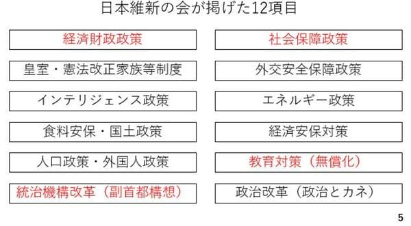 今週は日本維新の会が自民党との連立政協議に入りました。その際、12項目の政策を条件に掲げており、その内、赤字で記載した政策が政府の財政出動を必要とするものです。特に、統治機構改革の中にある副首都構想を巡っては、数兆円から10兆円規模の公共事業が動き出すとの指摘もきかれており、自公連立政権よりも財政の出動規模は大きくなる見通しとなっています。(その後、自民党と日本維新の会が連立政権の合意書に20日に署名することが報じられています)(スライド5)