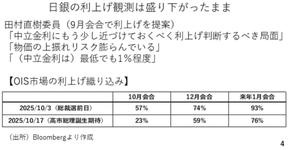 日銀の利上げ観測は依然として盛り上がりを欠いています。今週は9月会合で利上げを提案した田村審議委員が引き続き、利上げの必要性を訴えました。但し、OIS市場を見る限り、自民党総裁選の前と比べ、利上げの織り込みは後退したままです。(スライド4)