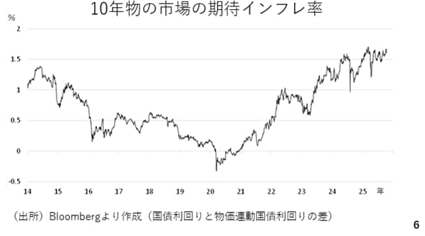 市場の期待インフレ率を示す10年物ブレークイーブンインフレ率をみますと、直近で最も高かった水準に迫っています。高市政権の成立に伴い、足元のインフレに更なる財政出動が被さることになり、インフレが加速する可能性が高まったといえるでしょう。ブレークイーブンインフレ率も直近の上限を上抜けする可能性が高いといえますが、これは次ページのメカニズムを通じ、円安圧力になると考えられます。(スライド6)