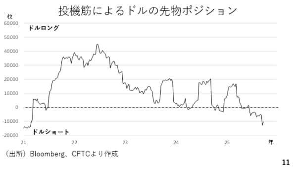 ドルが底堅い一因に先物市場における投機筋のドルのポジションが挙げられます。今年の4月以降、ドルショート(ドルの売り越し)が拡大しましたが、7月以降、ドルの下げ渋りを踏まえてドルの買い戻しが活発に進んでいる可能性が考えられます。(スライド11)