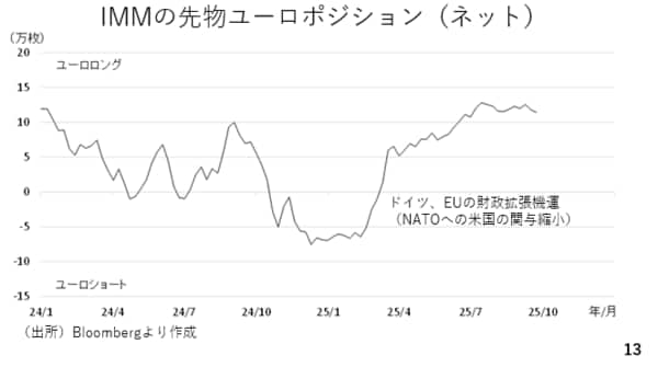 加えてドルとは対照的にユーロの先物市場における投機筋のポジションはユーロロング(ユーロの買い越し)です。今後1.20台に届かなかったことを踏まえ、ユーロロングの取り崩し、即ちユーロ売りが進みやすいと言えるでしょう。こうしたドルとユーロのポジションに照らせば、しばらくの間、ドルの持ち直しが続くと考えられます。(スライド13)