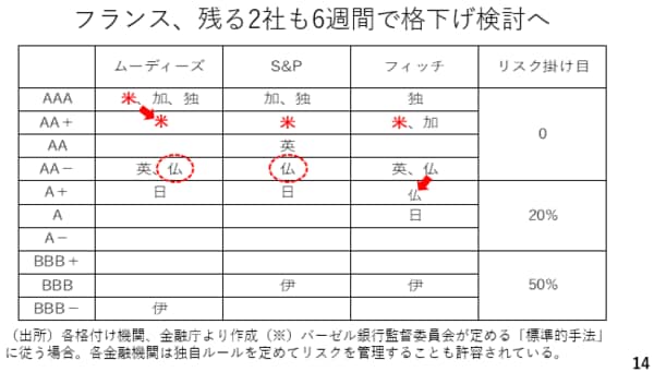 ユーロについてはフランスをめぐる格下げにも要注意です。大手の中でフランスをA(シングルA)に格下げしたフィッチに続き、ムーディーズやS&Pも6週間以内に格付けを見直すと報じられています。2社目もフランス国債をAに格下げした場合、フランス国債を保有している銀行にとって、リスク掛け目が20%に上がります。この結果、フランス国債が売られ、その場面でユーロ安が進む可能性もあります。同じユーロ圏の例えばドイツ国債にシフトするだけであれば為替相場への影響は限られますが要注意です。(※)17日、S&PはA+への格下げを発表しました。(スライド14)