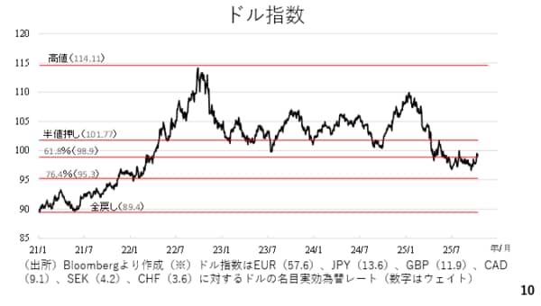 さて、足元では米国の政府機関閉鎖の解消が見通せておらず、今週のパウエル議長の発言に照らせば、年内2回の利下げも見込まれています。その上、先の地銀の信用不安や米中サミット開催を巡る不確実性など、ドルにとってのネガティブ材料が散見されました。その結果、今週はややドルが軟調に推移した一方、もう少し俯瞰してアメリカドルを見てみると7月以降に下げ止まり、ここまで持ち直しに転じています。(スライド10)