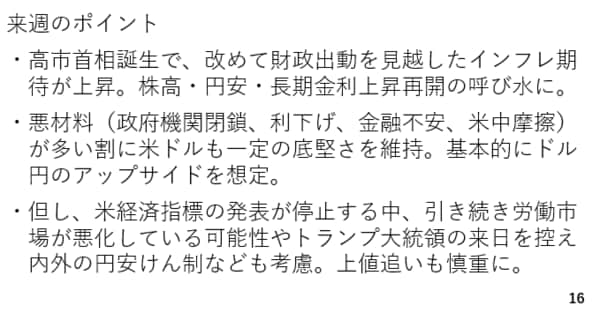 高市首相が誕生した場合、改めて財政出動を見越したインフレ期待の上昇によって株高・円安・長期金利の上昇が見込まれます。また、ドルも持ち直しつつある為、基本的に来週のドル円は上昇する可能性が高いのではないでしょうか。アメリカの地銀に対する信用不安が再び意識される場面があれば150円を割り込む可能性もありますが、まずは先週の高値である153円付近を改めて意識されそうです。一方、アメリカの労働市場が引き続き悪化している可能性があるほか、トランプ大統領の来日を前に国内外からの円安をけん制する声も予想されます。一段の上値追いには慎重姿勢も求められそうです。(スライド16)