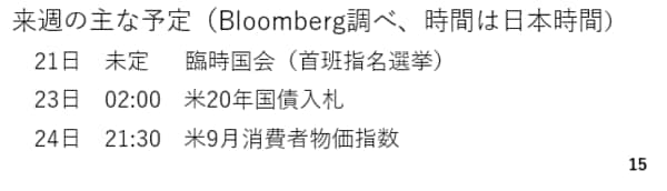 では、来週の予定です。アメリカの政府機関閉鎖の影響で、アメリカの経済指標の発表は引き続き限られます。24日に予定されている9月の消費者物価指数が注目されますが、注目は21日とされている臨時国会及び首班指名選挙でしょう。ここで高市首相が誕生する可能性が濃厚です。(自民党と日本維新の会が連立政権の合意書に20日に署名することが報じられており、高市首相誕生がほぼ確実な情勢です。)(スライド15)