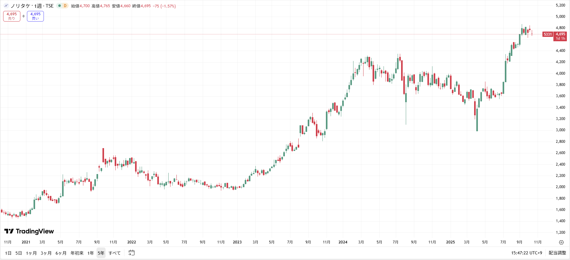 ストラテジックキャピタルは10月までに2回の買い増しを公表しており、保有比率は7.13%まで上昇しました。ノリタケの株価も値上がりが続き、現在は4695円(25年10月16日終値)と、ストラテジックキャピタルの最初の取得が判明してから約3カ月で20.1%上昇しています。