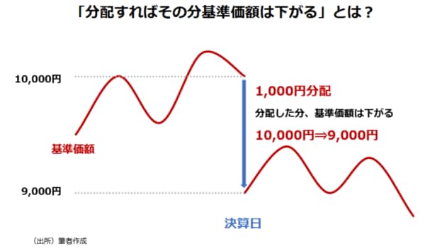 分配金は純資産の一部を削って捻出する。つまり、分配金を出せば純資産は減る。よって、純資産を口数で割った基準価額も下がる。簡単に言えば、1万口当たりの基準価額が1万円の時に、1万口当たり1000円の分配金を出したとしよう、基準価額は9000円(10000円-1000円)に下がる。