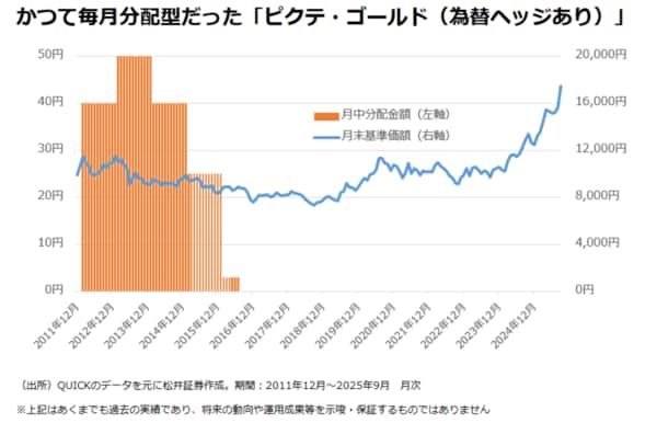 極端な話をいえば、キャッシュフローを生まない資産である金(ゴールド)を投資対象とするファンドでも金の現物価格や先物価格が上昇していれば、その分を分配原資に回すことができるし、実際に分配金を出していたゴールドのファンドもある(下のグラフを参照)。最近、外国株を投資対象とする毎月分配型ファンドが人気だが、キャピタルゲインから分配できる仕組みがあるからこそ、成り立っているとも言えるだろう(※2)。
