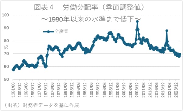 しかし、法人企業統計季報から簡便的に試算した労働分配率は1980年以来の水準まで低下しており、仮に労働生産性が上昇して交易条件や労働時間の寄与が押し上げに転じたとしても、実質賃金が上がりにくくなっている(図表4)。