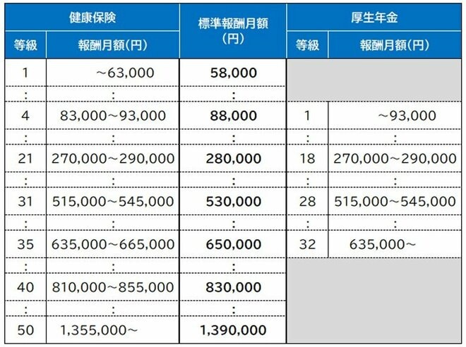 この表の見方としては、健康保険については、報酬月額が6.3万円未満の人は標準報酬月額が5.8万円で決定され、報酬月額が135.5万円以上の人は標準報酬月額が139万円で決定されるということです。同様に厚生年金については、報酬月額が9.3万円未満の人は標準報酬月額が8.8万円で決定され、報酬月額が63.5万円以上の人は標準報酬月額が65万円で決定されます。