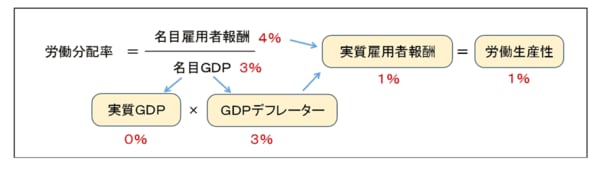 このように、単純な頭の体操ですが、企業が得られた資金を適切に雇用者に配分して、少なくとも労働分配率を現在の水準に維持するということが、労働生産性の引き上げ努力に見合った実質雇用者報酬の実現という観点から極めて重要だということが分かります。
