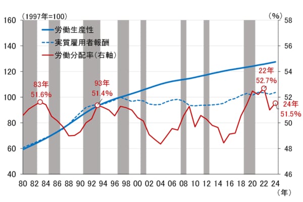 もし、企業が余剰資金をため込み、賃金を不当に抑制しているなら、労働分配率は低下しているはずです。実際、日本の労働分配率(名目雇用者報酬を名目国内総生産(GDP)で割った比率)を見ると(図表5)、2024年時点で51.5%と、1980年以降のピークである2022年末の52.7%よりは低いものの、長い目で見れば特に低いわけではなく、80年代や90年代のピークと同レベルです。